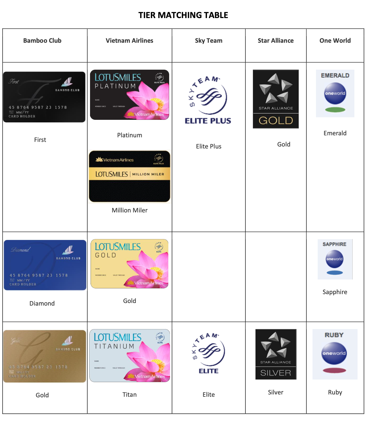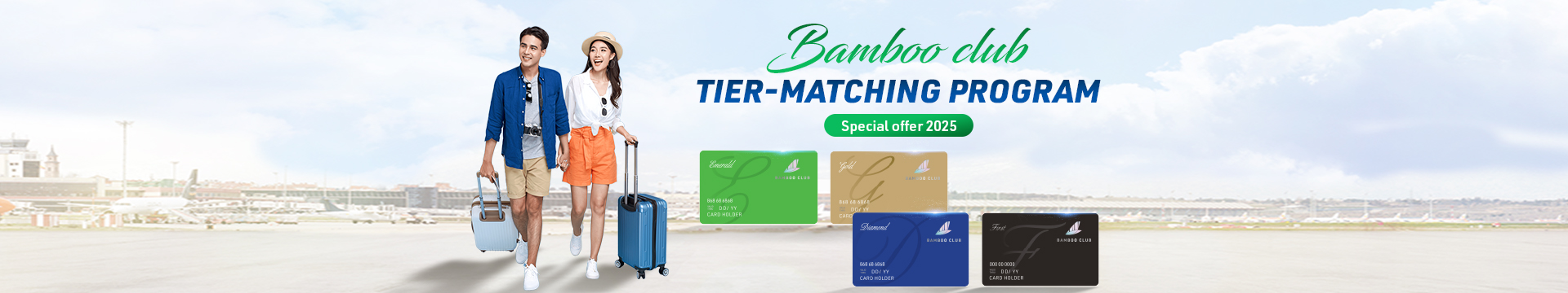 At the airport check-in counter, please provide your Bamboo Club membership number, National ID/Passport, and the physical membership card from your current airline to our Bamboo Airways staff to enjoy a matched tier within Bamboo Club.