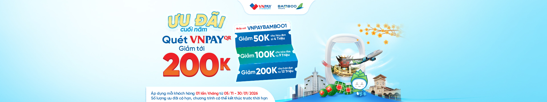 Ưu Đãi 11.11 - Bay Tới Deal Hời Chọn Bamboo, Quét Momo – Bay Tiết Kiệm Hơn Ưu Đãi Cuối Năm, Quét Vnpay Giảm Tới 200k Tất cả Ưu Đãi
