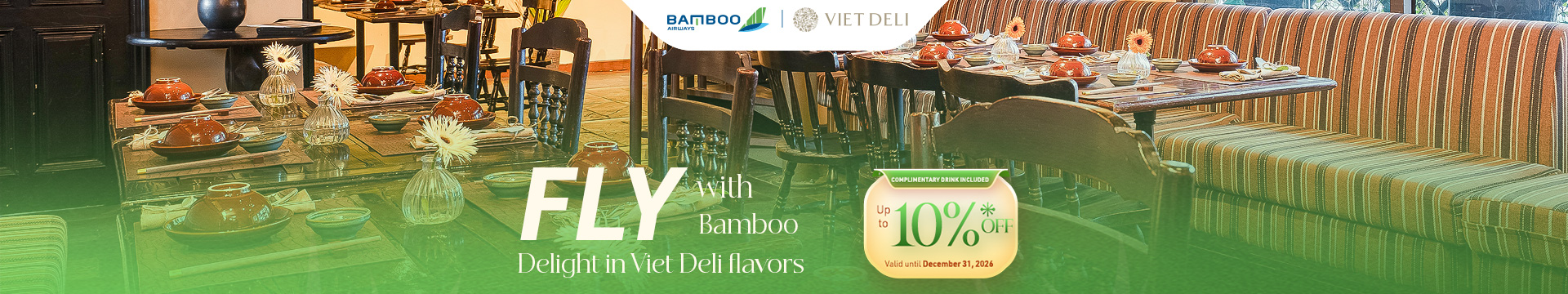 This exclusive promotion is specially designed for Bamboo Club members and Bamboo Airways passengers, where every journey is beautifully extended — from smooth, relaxing flights in the sky to carefully curated dining experiences at Viet Deli’s restaurant collection in Hanoi, Ho Chi Minh City, Da Nang, Hoi An, and Nha Trang. Each destination reflects a commitment to refined cuisine and service excellence.